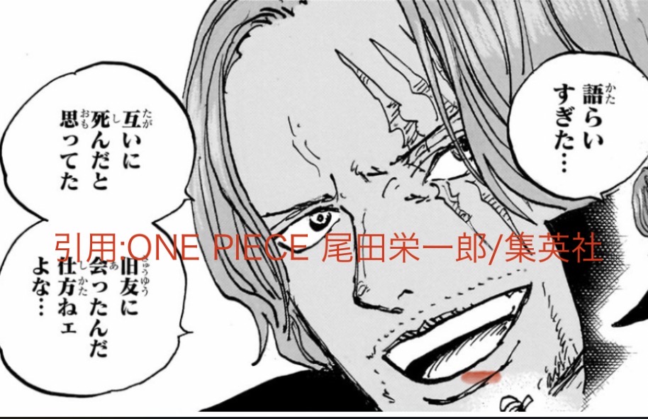 シャンクスが酒場っぽい空気で「語らいすぎた」って言いながら、 「互いに死んだと思ってた旧友に会った」的なニュアンスをさらっと落とす。